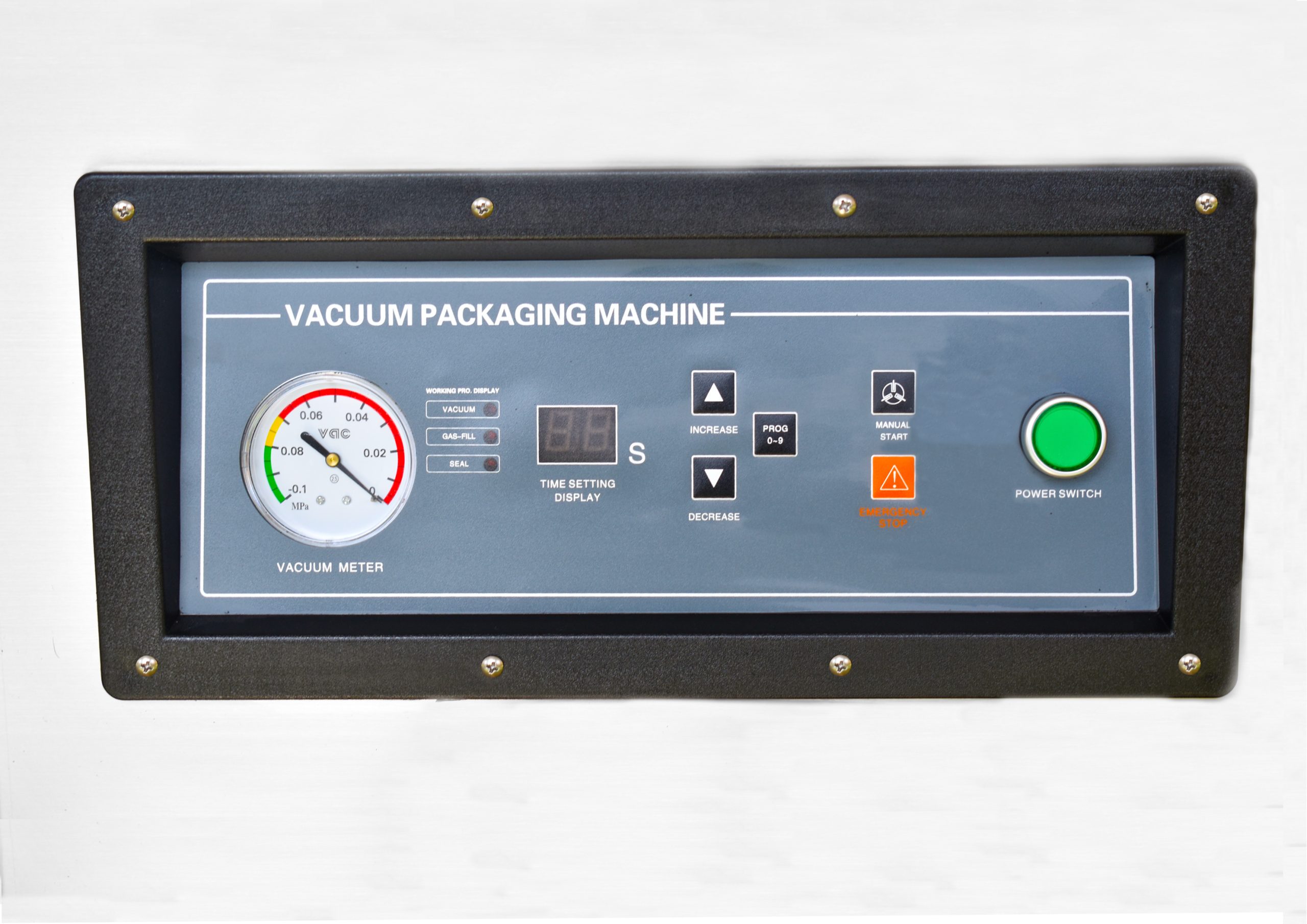 The machine supports up to 10 programmable control settings for customized vacuum and sealing cycles.